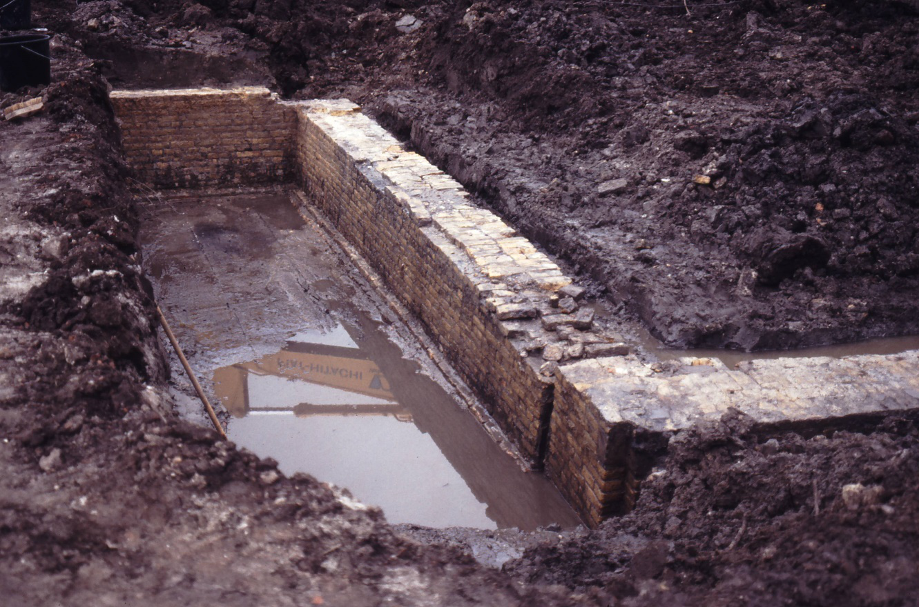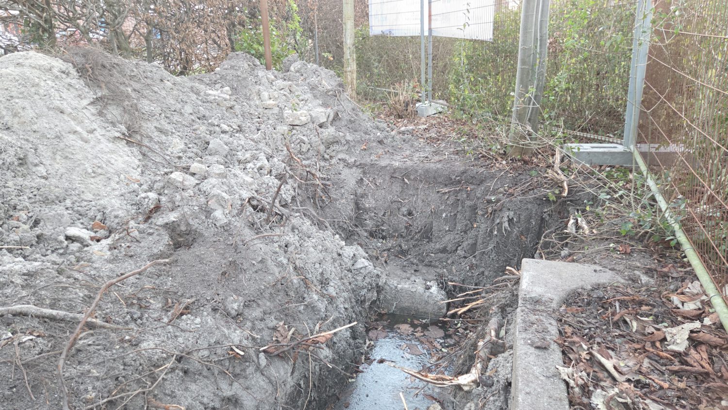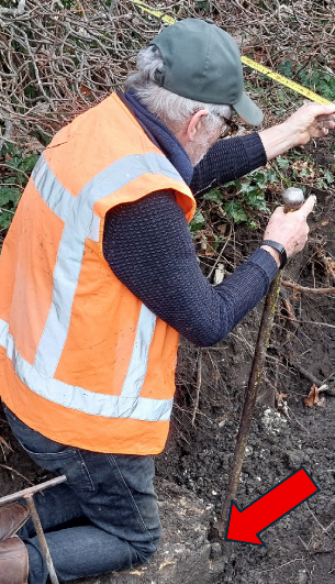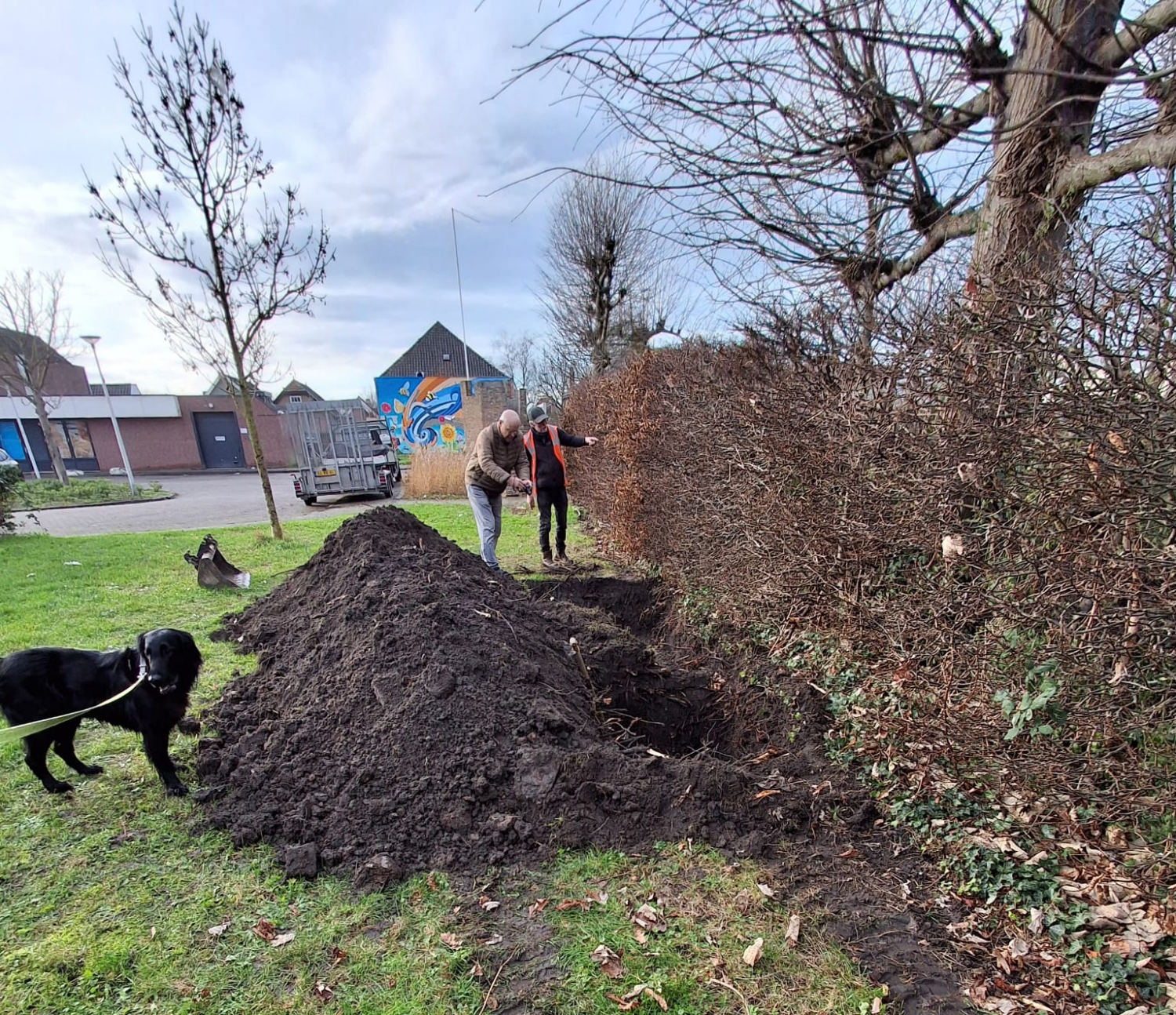 Op 16 december 2025 is begonnen met de werkzaamheden middels een tweetal kleine opgravingen om de hoekpunten van het schuitenhuis te lokaliseren en de grondwaterstand te onderzoeken. Hieronder volgt een klein fotoverslag (omcirkeld zijn de twee oude draaiknoppen waar de deuren van het schuitenhuis op bevestigd waren).