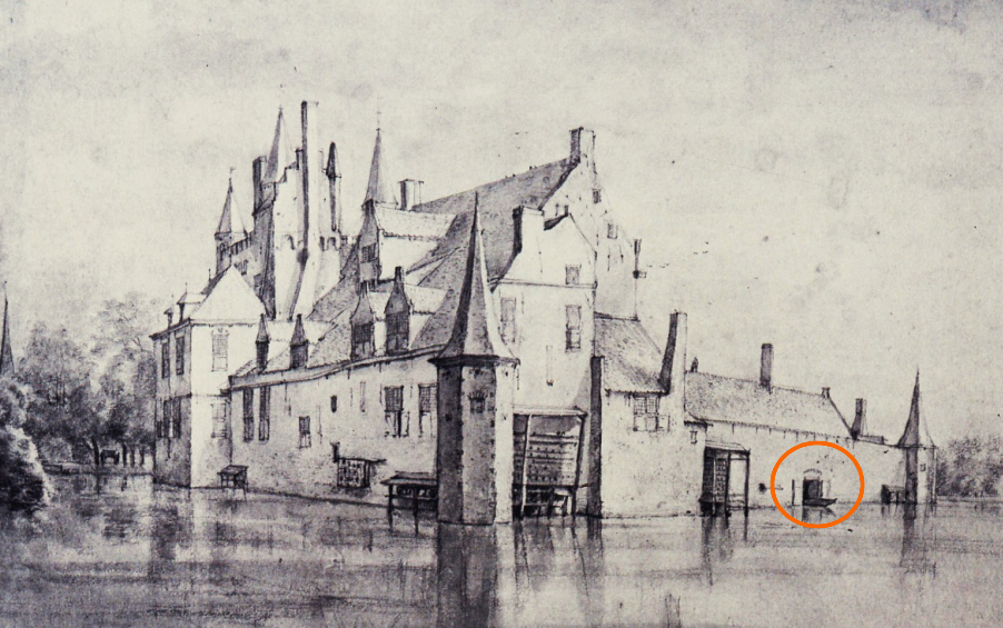 Bij de opgraving in 1978 is het schuitenhuis blootgelegd. Het had een bodem van hergebruikt (scheeps)hout. Bij de toegang zaten in het muurwerk nog de duimen waarop de toegangsdeuren draaiden. Een onderzoekje naar de ruim 200 kasteeltekeningen van Roghman leverde geen andere inpandige schuitenhuisjes op. Wel hadden verschillende kastelen in de gracht een overkapt schuitenhuis, bijvoorbeeld bij kasteel Amerongen. Later kwam bij dit kasteel een inpandig schuitenhuis, dat bewaard is gebleven.
